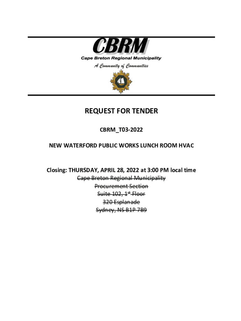 A Community of CommunitiesREQUEST FOR TENDER BRM_T032022 NEW WATERFORD PUBLIC WORKS Lunchroom HVAC Closing: THURSDAY, APRIL 28, 2022, at 3:00 PM local time Cape Breton Regional Municipality Procurement