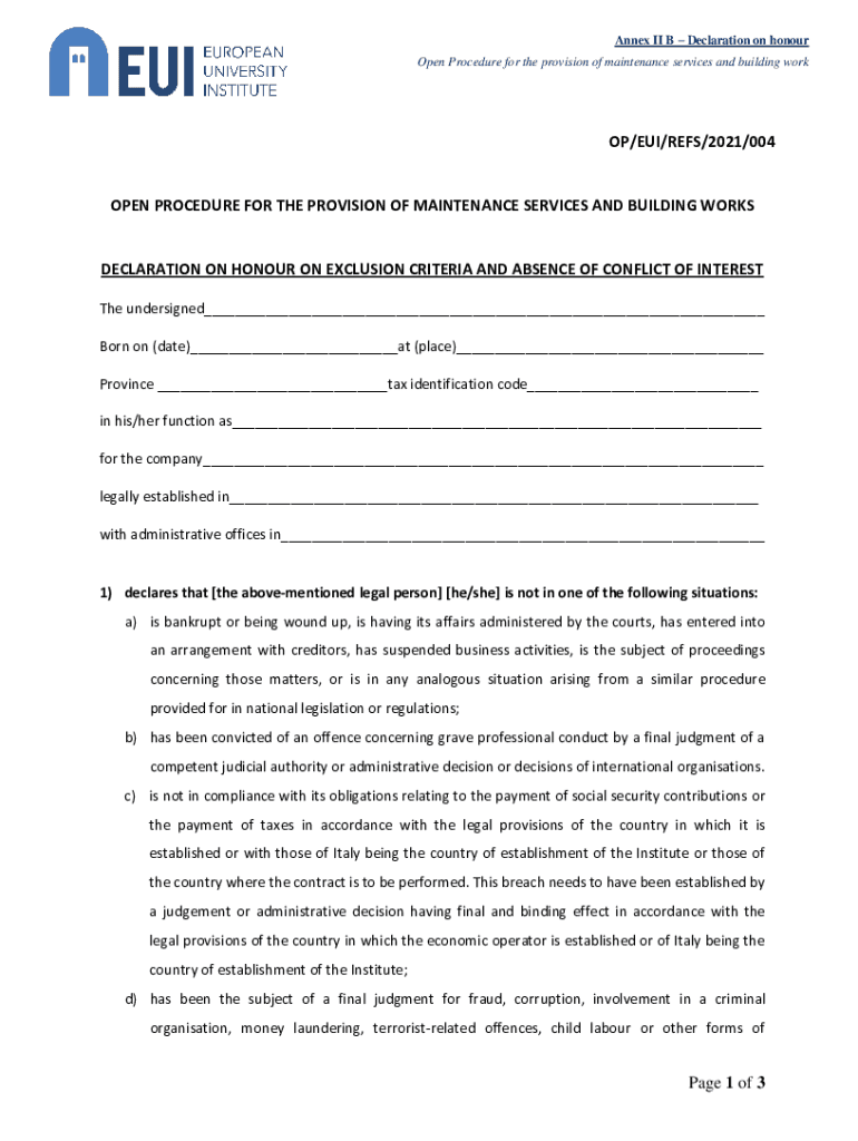 Annex II B Declaration on honor Open Procedure for the provision of maintenance services and building workup/EU/REFS/2021/004OPEN PROCEDURE FOR THE PROVISION OF MAINTENANCE SERVICES AND BUILDING WORKSDECLARATION
