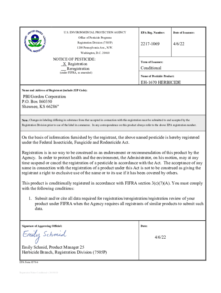 U.S. ENVIRONMENTAL PROTECTION AGENCY EPA Reg. Number:Date of Issuance:221710694/6/22Office of Pesticide Programs Registration Division (7505P) 1200 Pennsylvania Ave., N.W. Washington, D.C. 20460NOTICE