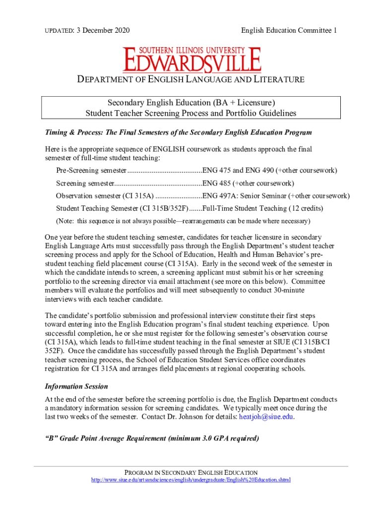 Get the free Secondary English Education (BA + Licensure) Student Teacher Screening ...