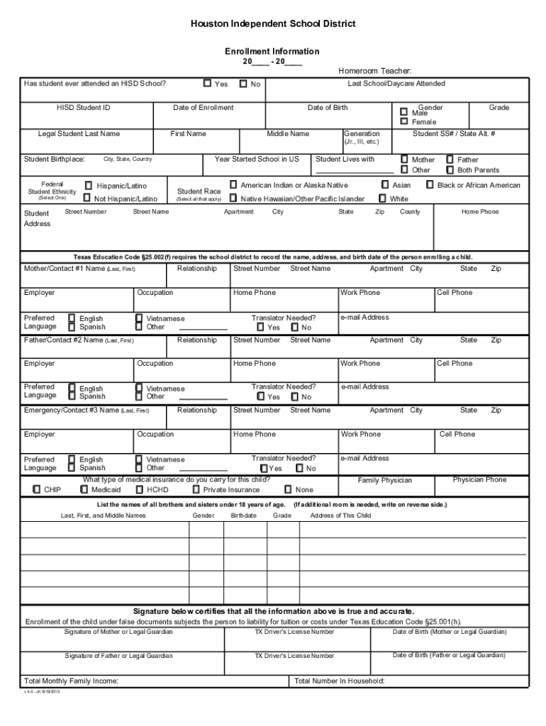 Houston Independent School District Enrollment Information 20___ 20___Homeroom Teacher: Meshes student ever attended a School? HIS Student ID Federal Student Ethnicity (Select One)Date of Birthright