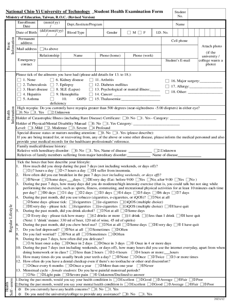 National China University of Technology _Student Health Examination FormStudent No. Ministry of Education, Taiwan, R.O.C. (Revised Version)Basic InformationEnrollment Date(mm)/(by) Dept./Institute/Program