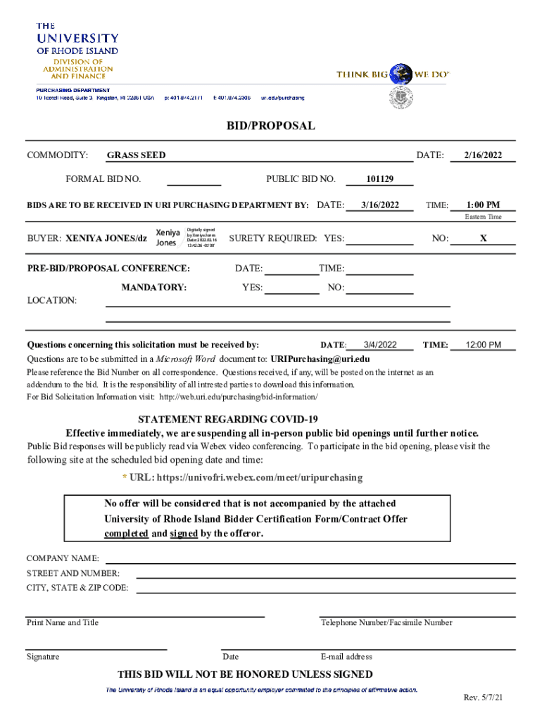 BID/PROPOSAL COMMODITY:GRASS SEDATE:FORMAL BID NO.PUBLIC BID NO.BIDS ARE TO BE RECEIVED IN URI PURCHASING DEPARTMENT BY: DATE:2/16/2022101129 3/16/2022TIME:1:00 PM Eastern TimeXeniyaBUYER: XENIA JONES/dz