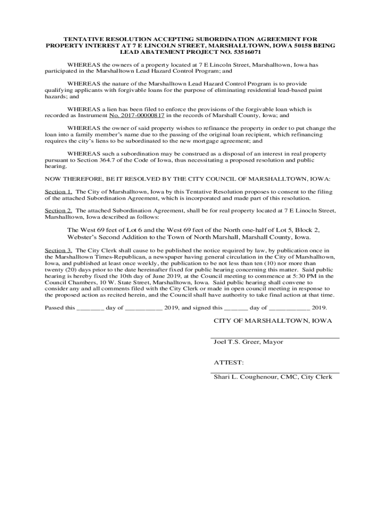 TENTATIVE RESOLUTION ACCEPTING SUBORDINATION AGREEMENT FOR PROPERTY INTEREST AT 7 E LINCOLN STREET, MARSHALLTOWN, IOWA 50158 BEING LEAD ABATEMENT PROJECT NO. 53516071 WHEREAS the owners of a property