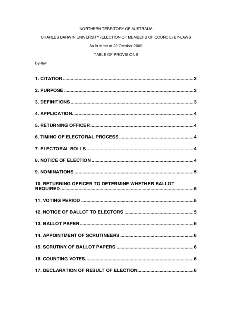 NORTHERN TERRITORY OF AUSTRALIA CHARLES DARWIN UNIVERSITY (ELECTION OF MEMBERS OF COUNCIL) BYLAWS As in force at 22 October 2009 TABLE OF PROVISIONS Bylaw1. CITATION ....................................................................................................