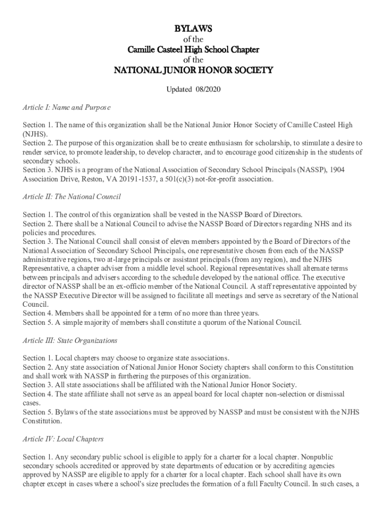 BYLAWS of the Camille Ca steel High School Chapter of the NATIONAL JUNIOR HONOR SOCIETY Updated 08/2020 Article I: Name and Purpose Section 1. The name of this organization shall be the National Junior
