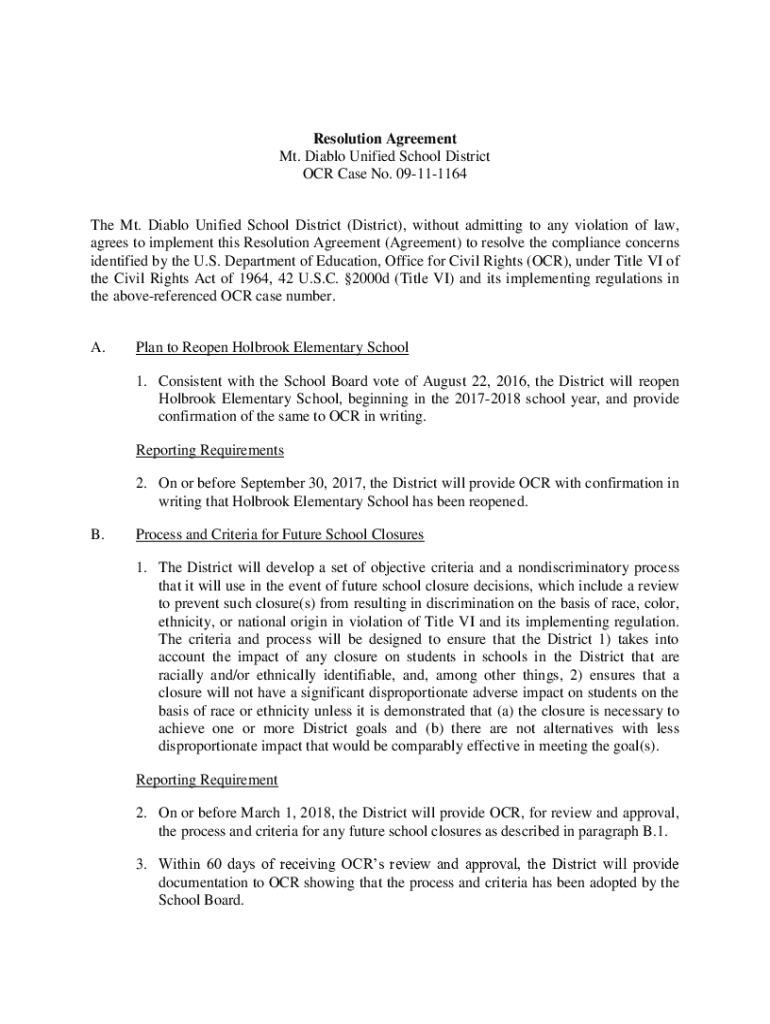 Resolution Agreement Mt. Diablo Unified School District OCR Case No. 09111164 The Mt. Diablo Unified School District (District), without admitting to any violation of law, agrees to implement this