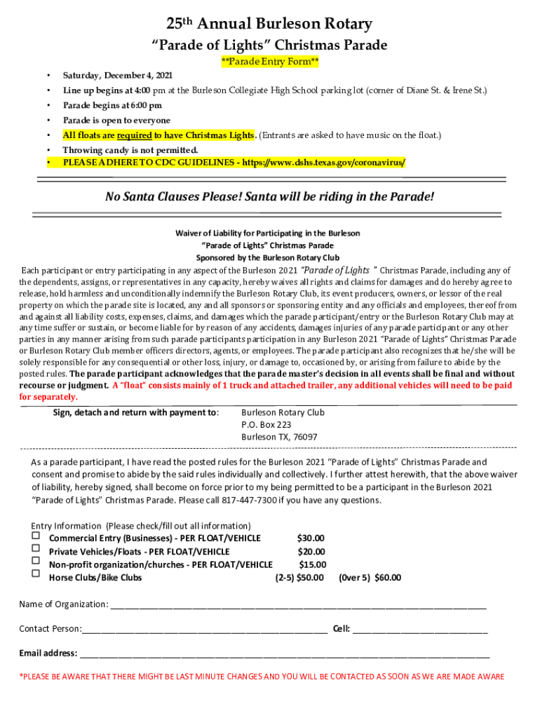 25th Annual Burleson Rotary Parade of Lights Christmas Parade **Parade Entry Form** Saturday, December 4, 2021Line up begins at 4:00 pm at the Burleson Collegiate High School parking lot (corner of