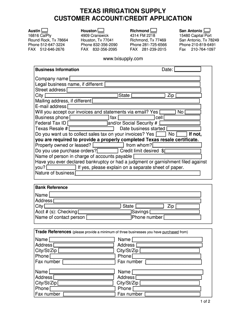 TEXAS IRRIGATION SUPPLY CUSTOMER ACCOUNT/CREDIT APPLICATION Austin 16816 Calmly Round Rock, TX 78664 Phone 512-647-3224 FAX 512-646-2676 Houston 4909 Brunswick Houston, TX 77041 Phone 832-356-2090