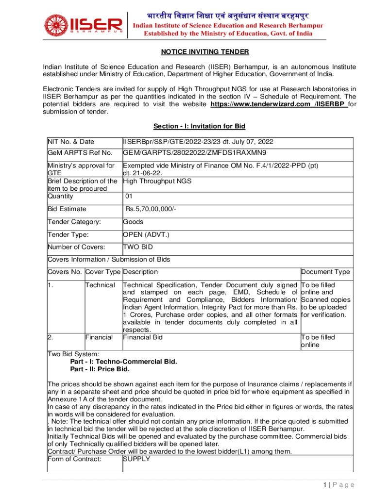 Get the free notice inviting tender - IISER Berhampur