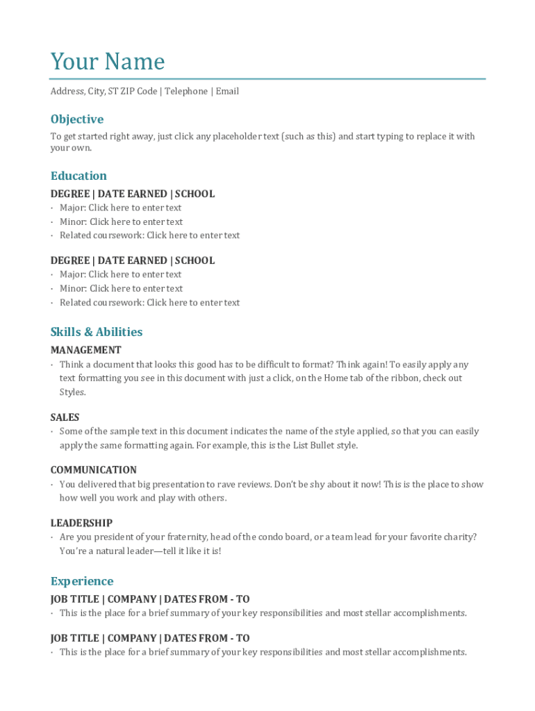 Your Headdress, City, ST ZIP Code | Telephone | EmailObjectiveTo get started right away, just click any placeholder text (such as this) and start typing to replace it with your own. EducationDEGREE
