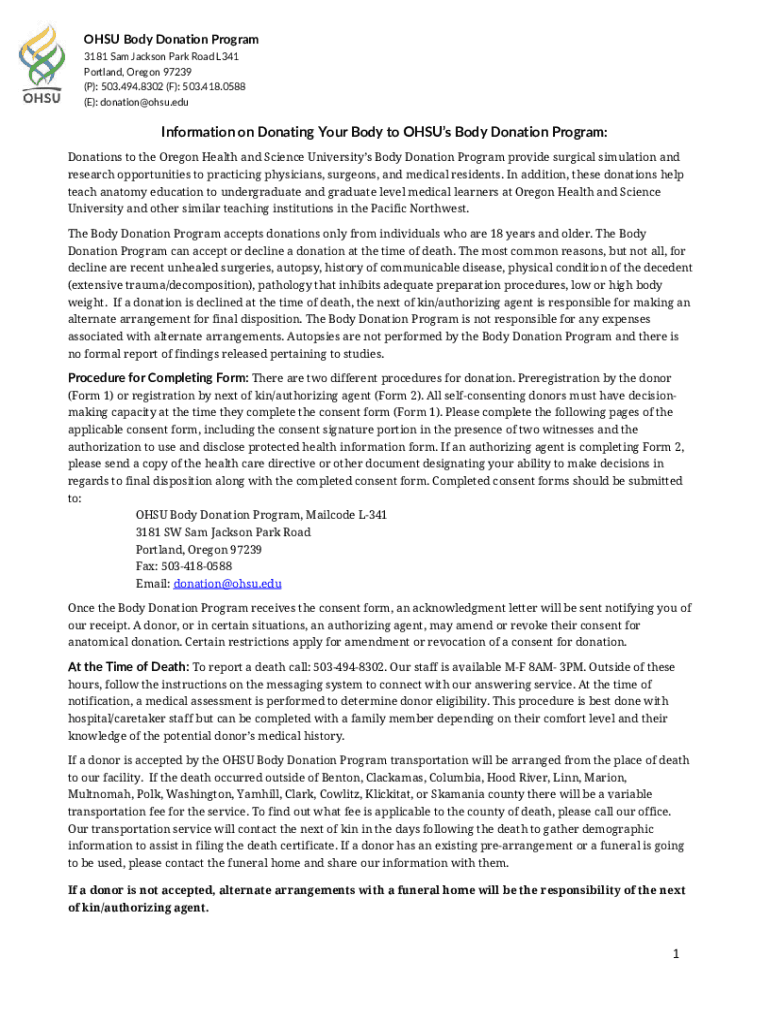 OSU Body Donation Program 3181 Sam Jackson Park Road L341 Portland, Oregon 97239 (P): 503.494.8302 (F): 503.418.0588 (E): donation@ohsu.eduInformation on Donating Your Body to Thus Body Donation Program: