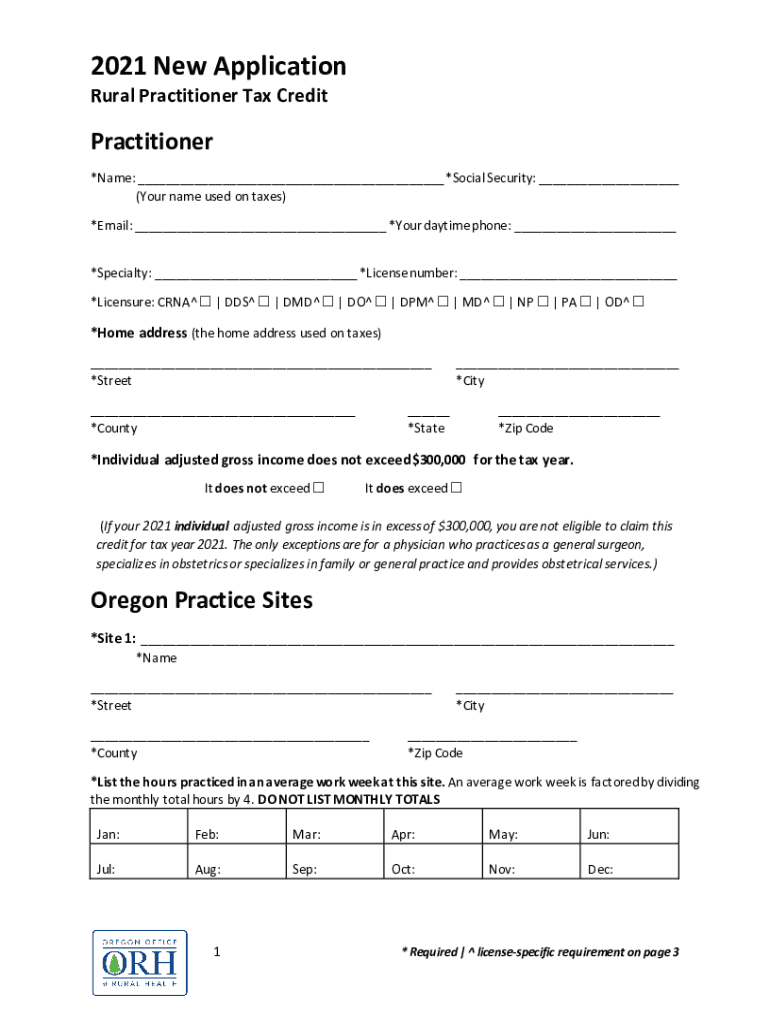 2021 New Application Rural Practitioner Tax CreditPractitioner *Name: ___ *Social Security: ___ (Your name used on taxes) *Email: ___ *Your daytime phone: ___ *Specialty: ___ *License number: ___