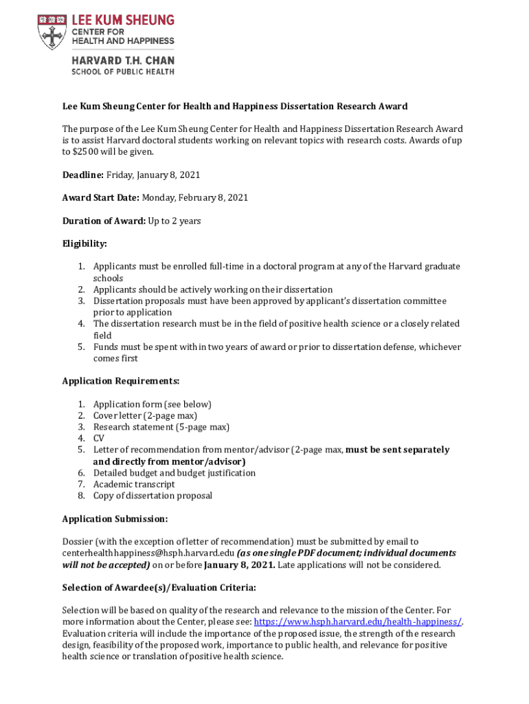 The purpose of the Lee Km Cheung Center for Health and Happiness Dissertation Research Award