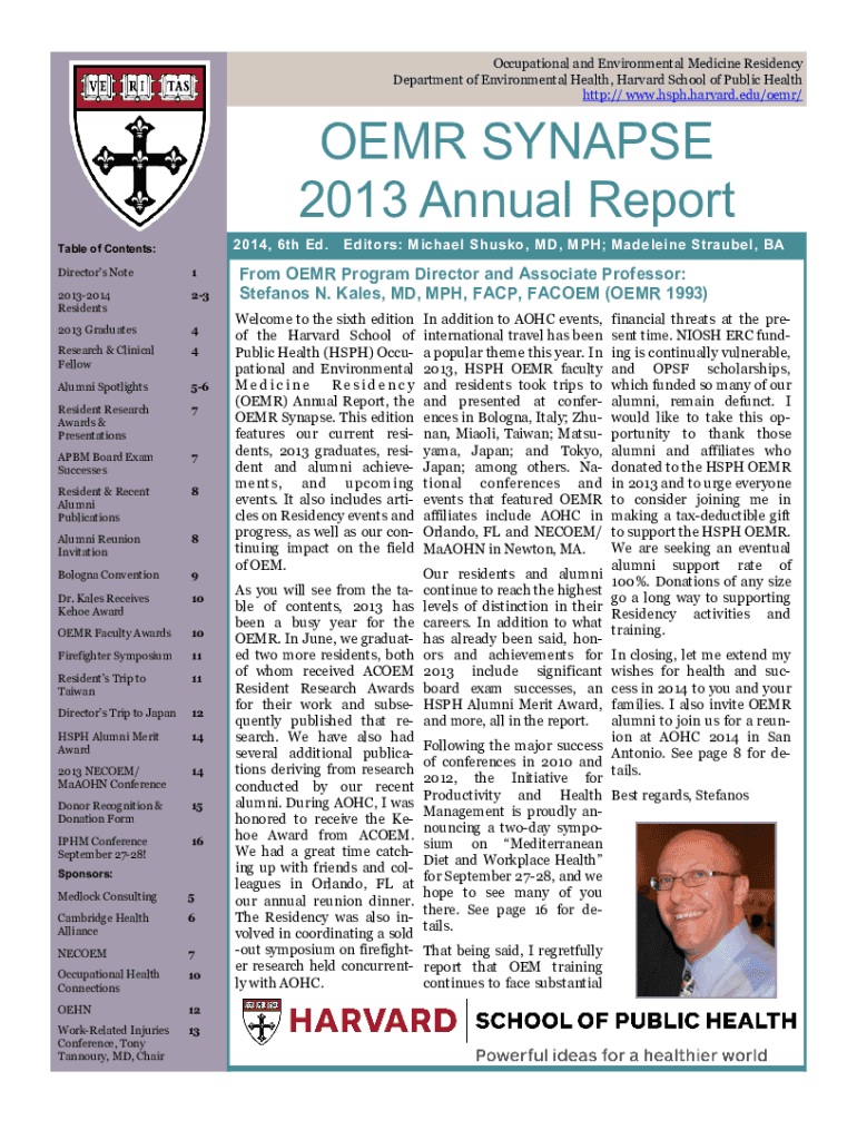 Occupational and Environmental Medicine Residency Department of Environmental Health, Harvard School of Public Health http:// www.hsph.harvard.edu/oemr/OEMR SYNAPSE 2013 Annual Report 2014, 6th Ed.