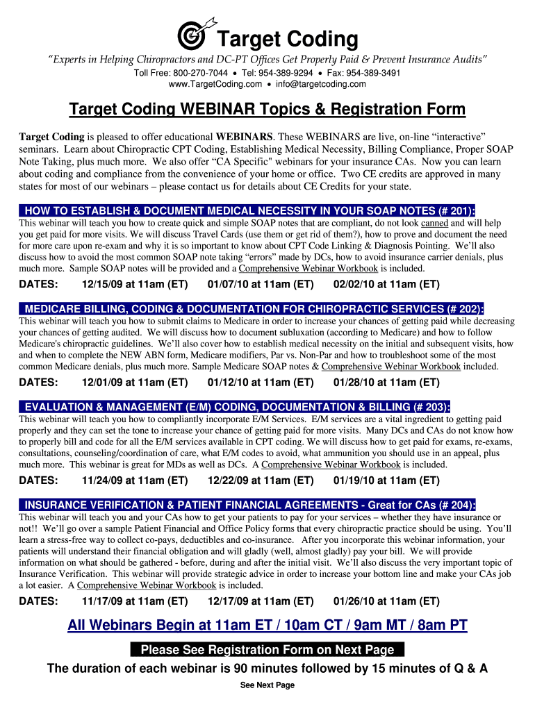 Target Coding Experts in Helping Chiropractors and DC-PT Offices Get Properly Paid & Prevent Insurance Audits Toll Free: 800-270-7044 Tel: 954-389-9294 Fax: 954-389-3491 www.TargetCoding.com info