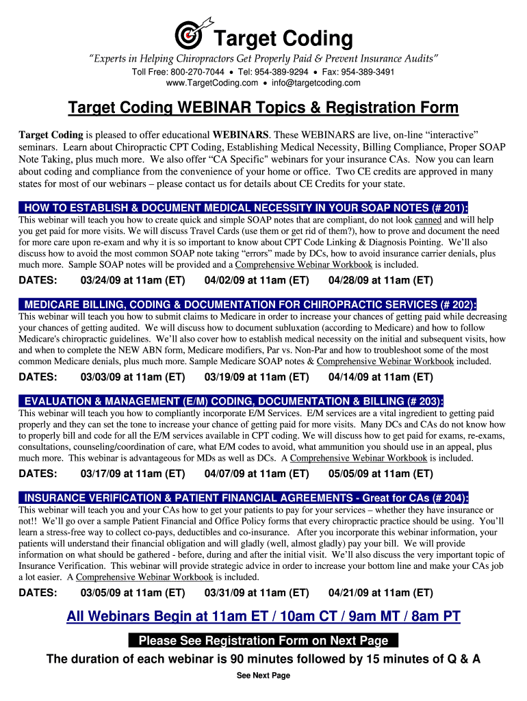 Target Coding Experts in Helping Chiropractors Get Properly Paid & Prevent Insurance Audits Toll Free: 800-270-7044 Tel: 954-389-9294 Fax: 954-389-3491 www.TargetCoding.com info targetcoding.com Target