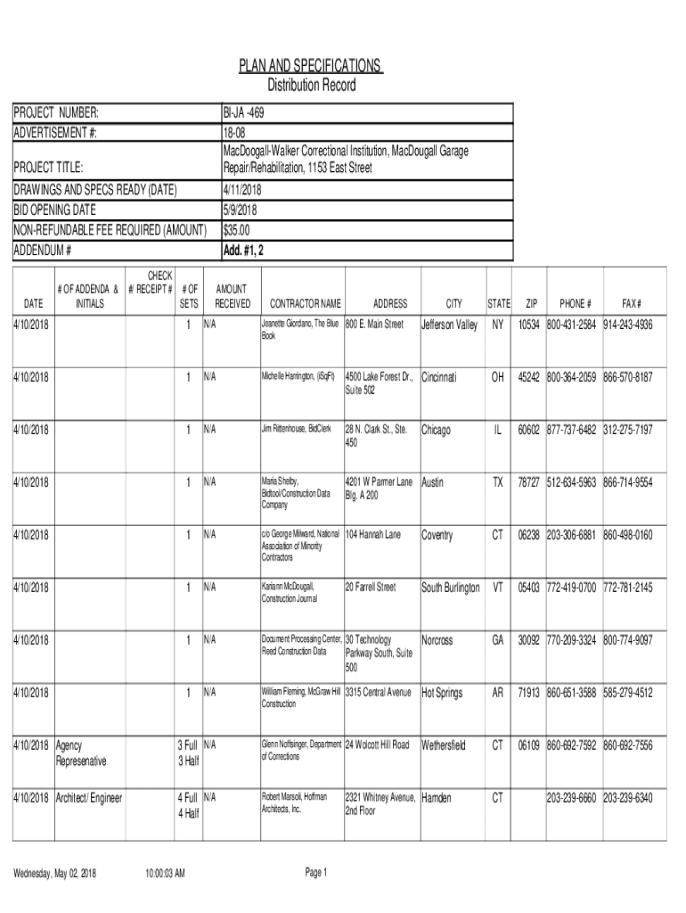 PLAN AND SPECIFICATIONS Distribution Record PROJECT NUMBER: ADVERTISEMENT #:BIA 469 1808 MacDoogallWalker Correctional Institution, MacDougall Garage Repair/Rehabilitation, 1153 East Street 4/11/2018