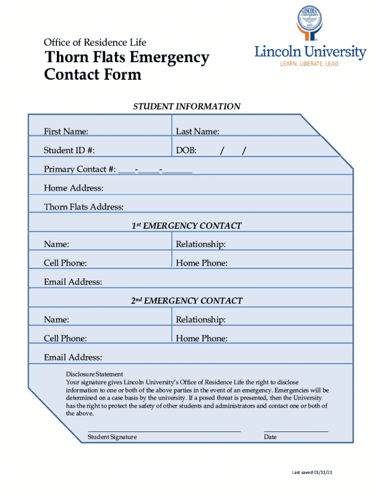 Office of Residence Leghorn Flats Emergency Contact Form\”\' \”\'STUDENT INFORMATIONFirst Name:Last Name:Student ID#:DOB:Primary Contact#:Home Address: Thorn Flats Address: 1st EMERGENCY Contaminate:Relationship:Cell