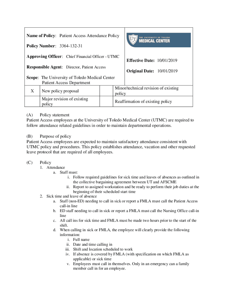 Name of Policy: Patient Access Attendance Policy Number: 336413231 Approving Officer: Chief Financial Officer UTC Responsible Agent: Director, Patient AccessEffective Date: 10/01/2019 Original Date:
