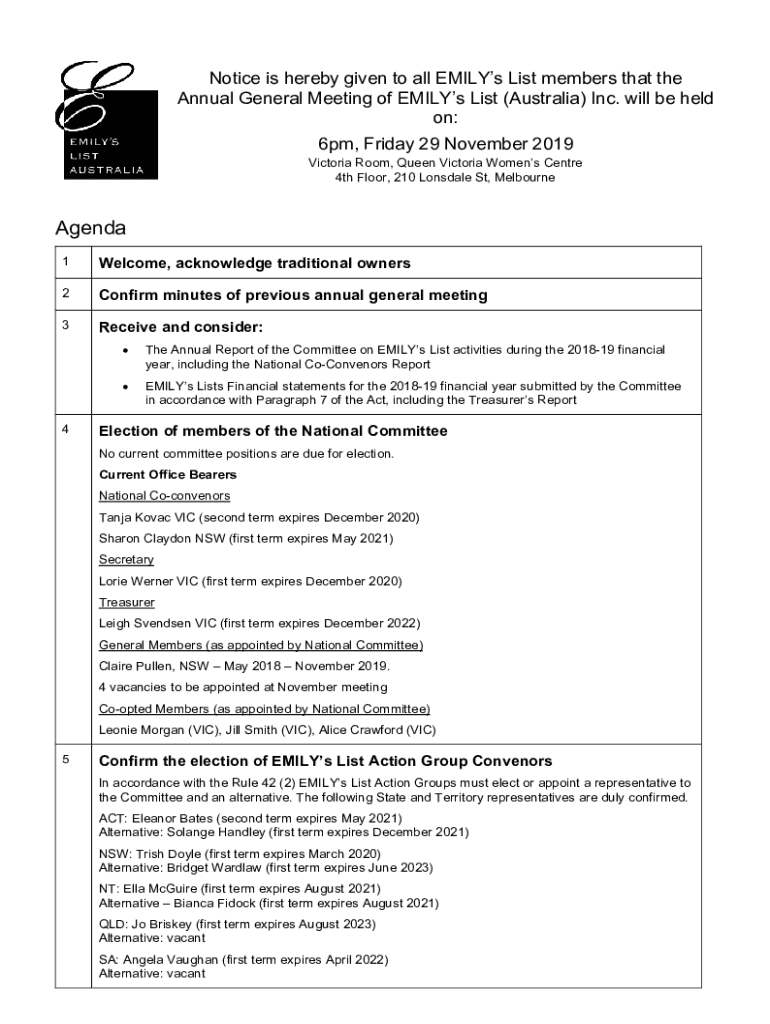 Notice is hereby given to all Emily List members that the Annual General Meeting of Emily List (Australia) Inc. will be held on: 6pm, Friday 29 November 2019Victoria Room, Queen Victoria Women's Center