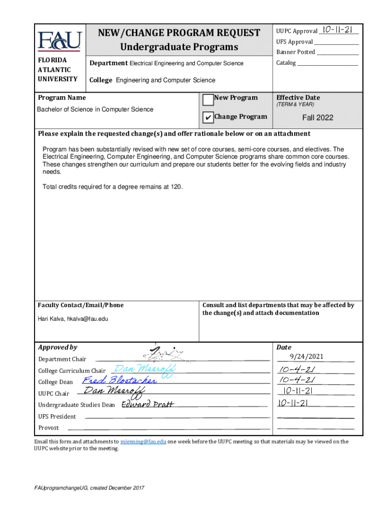 NEW/CHANGE PROGRAM REQUEST Undergraduate Programs FLORIDA ATLANTIC UNIVERSITYDepartment Electrical Engineering and Computer ScienceUUPC Approval ___ UFS Approval ___ Banner Posted ___ Catalog ___College