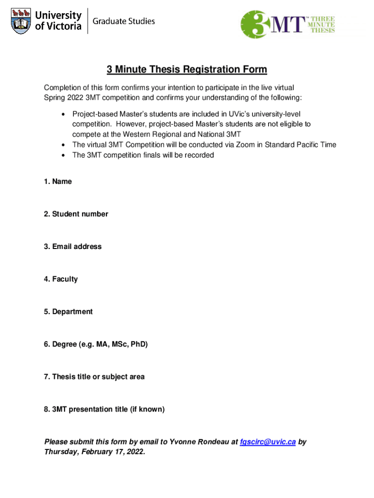 3 Minute Thesis Registration Form Completion of this form confirms your intention to participate in the live virtual Spring 2022 3MT competition and confirms your understanding of the following: Project
