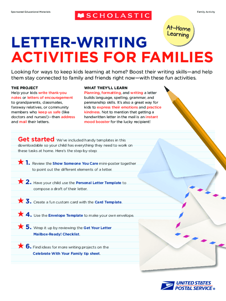 Sponsored Educational MaterialsFamily ActivityAtHome LearningLETTERWRITING ACTIVITIES FOR FAMILIES Looking for ways to keep kids learning at home? Boost their writing skill sand help them stay connected