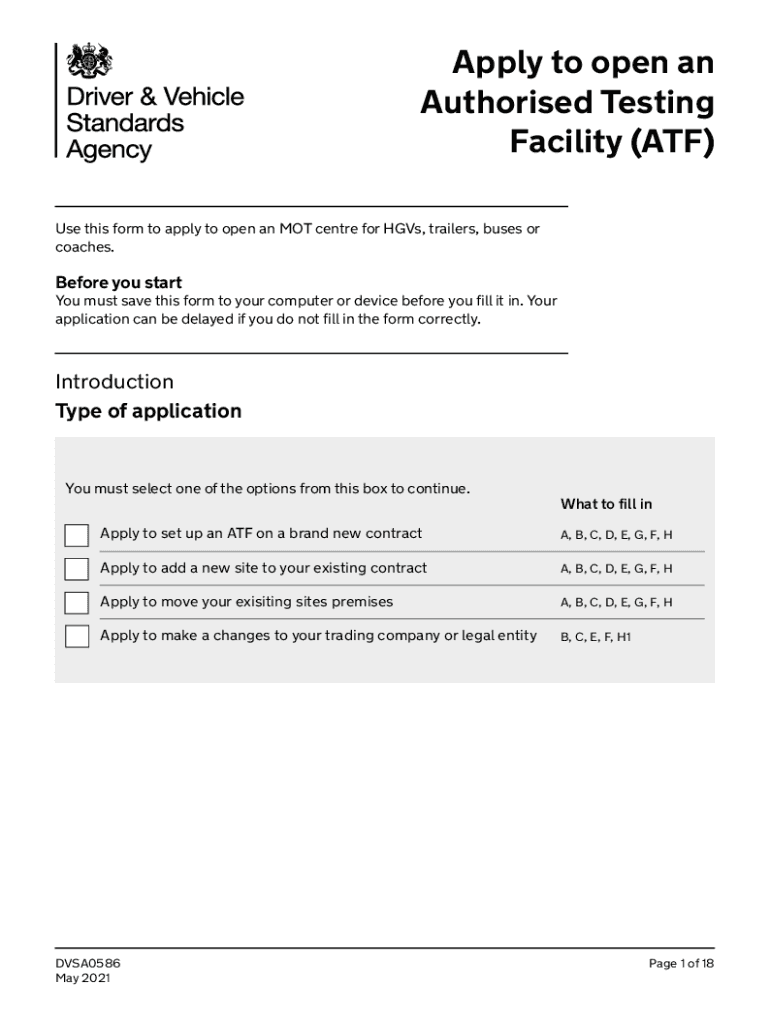 Apply to open an Authorized Testing Facility (ATF) Use this form to apply to open an MOT center for His, trailers, buses or coaches. Before you station must save this form to your computer or device
