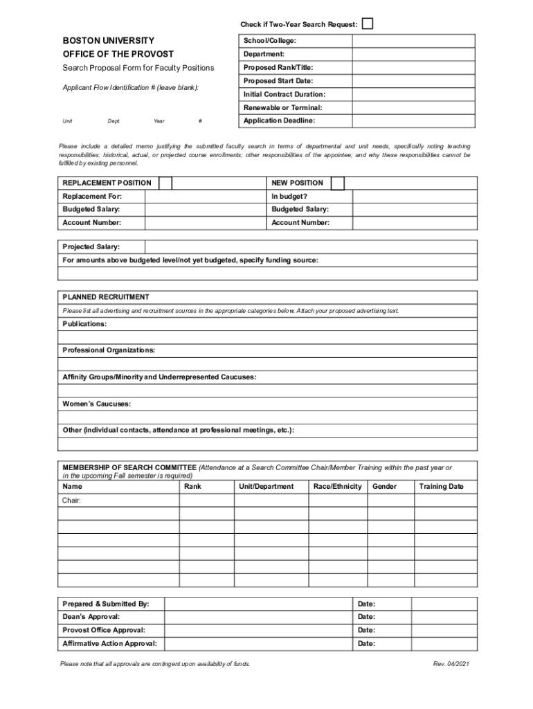 Check if Twofer Search Request:BOSTON UNIVERSITY OFFICE OF THE PROVOSTSchool/College:Search Proposal Form for Faculty PositionsProposed Rank/Title:Department:Applicant Flow Identification # (leave