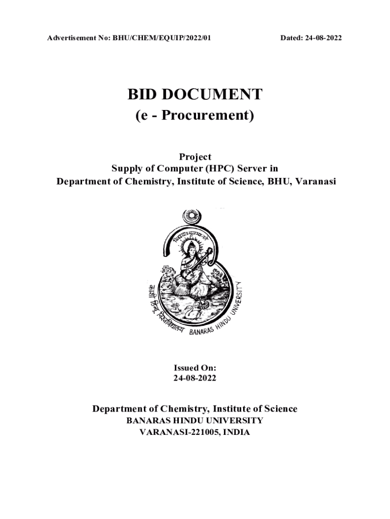 Advertisement No: BHU/CHEM/EQUIP/2022/01Dated: 24082022BID DOCUMENT (e Procurement) Project Supply of Computer (HPC) Server in Department of Chemistry, Institute of Science, BHU, VaranasiIssued On: