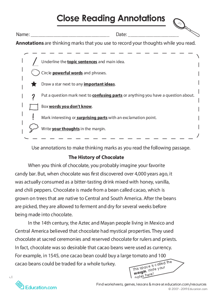 Close Reading Annotations Name: ___Date: ___Annotations are thinking marks that you used to record your thoughts while you read. Underline the topic sentences and main idea. Circle powerful words