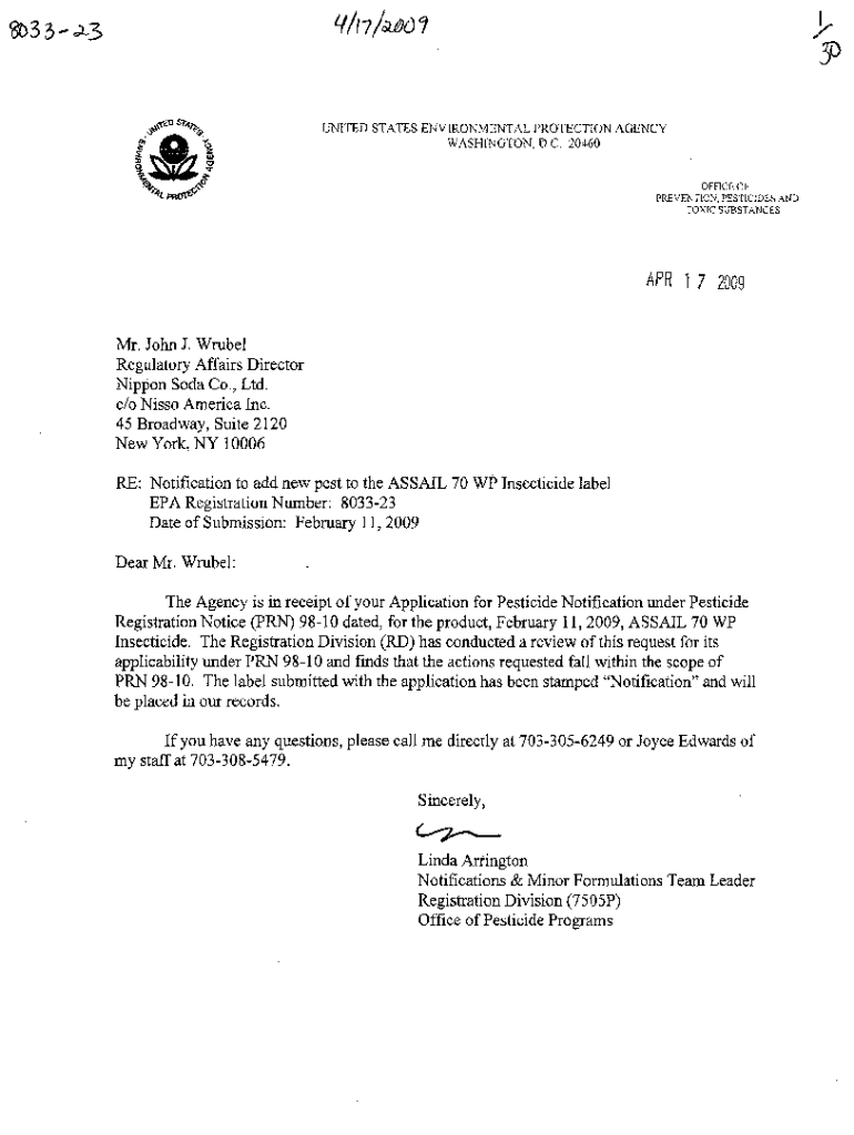 UNITED STATES ENVIRONMENTAL PROTECTION AGENCY WASHINGTON, D.C. 20460OFFICE OF PREVENTION, PESTICIDES ...ND TOXIC SUBSET ...CESAR 1 7 2009 Mr. John J. Rebel Regulatory Affairs Director Nippon Soda