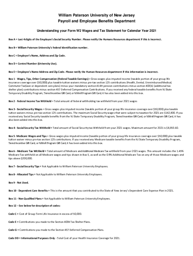 William Paterson University of New Jersey Payroll and Employee Benefits Department Understanding your Form W2 Wages and Tax Statement for Calendar Year 2021 Box A Last 4 digits of the Employee\'s