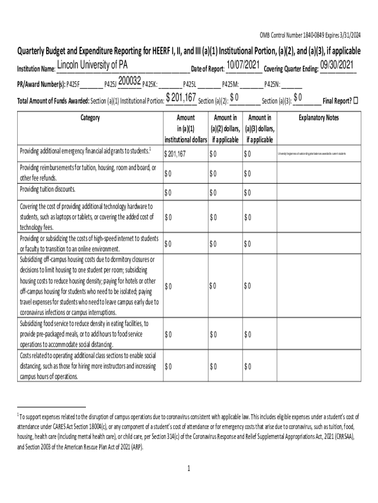 OMBControlNumber18400849Expires3/31/2024 QuarterlyBudgetandExpenditureReportingforHEERFI, II, Andrei(a)(1)Institutionalization, (a)(2), and(a)(3), inapplicable Lincoln University of PA 10/07/2021