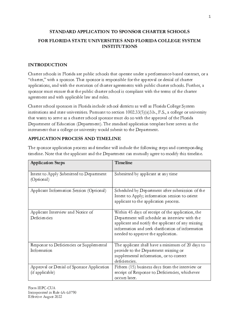 1STANDARD APPLICATION TO SPONSOR CHARTER SCHOOLS FOR FLORIDA STATE UNIVERSITIES AND FLORIDA COLLEGE SYSTEM INSTITUTIONS INTRODUCTION Charter schools in Florida are public schools that operate under