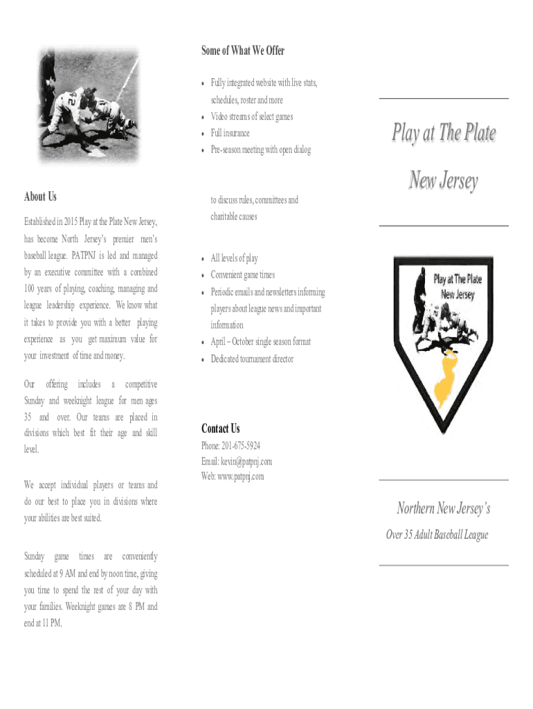 Some of What We Offer About Us Established in 2015 Play at the Plate New Jersey, has become North Jerseys premier men baseball league. PATENT is led and managed by an executive committee with a combined