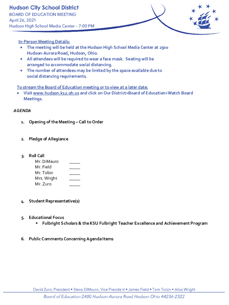 BOARD OF EDUCATION MEETING April 26, 2021, Hudson High School Media Center 7:00 Pinkerton Meeting Details: The meeting will be held at the Hudson High School Media Center at 2500 Hudson Aurora Road,