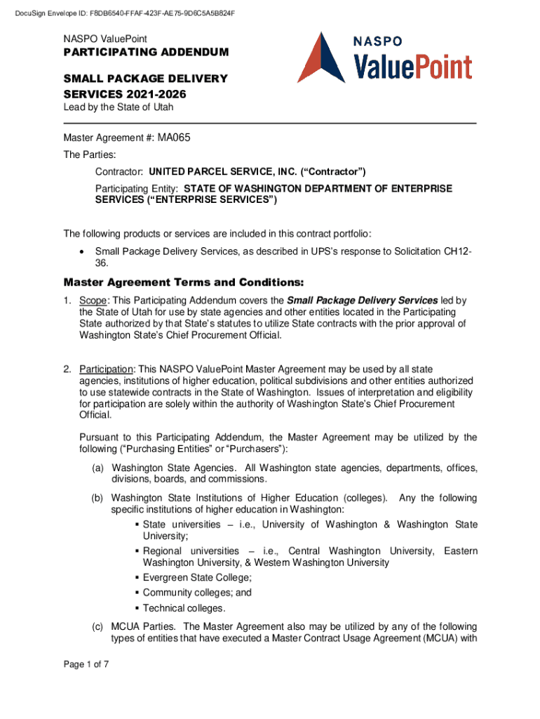 DocuSign Envelope ID: F8DB6540FFAF423FAE759D6C5A5B824FNASPO ValuePointPARTICIPATING ADDENDUM SMALL PACKAGE DELIVERY SERVICES 20212026 Lead by the State of Utah Master Agreement #: MA065 The Parties: