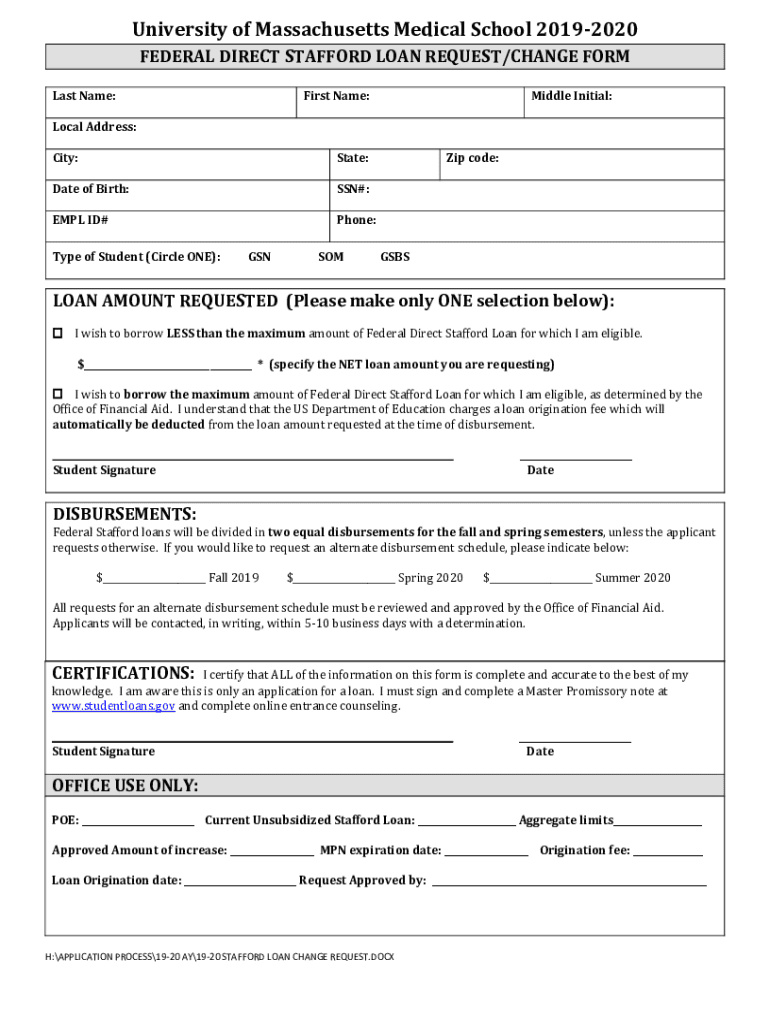 University of Massachusetts Medical School 20192020 FEDERAL DIRECT STAFFORD LOAN REQUEST/CHANGE FORM Last Name:First Name:Middle Initial:Local Address: City:State:Date of Birth:SSN#:EMIL ID#Phone:Type