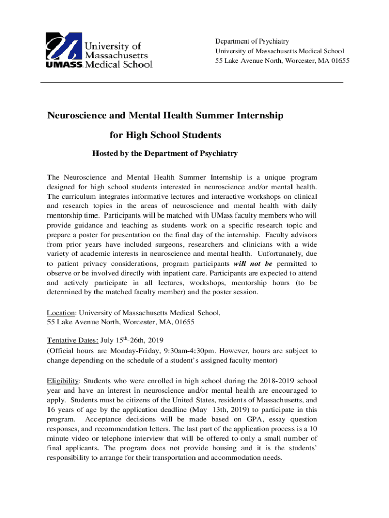 Department of Psychiatry University of Massachusetts Medical School 55 Lake Avenue North, Worcester, MA 01655Neuroscience and Mental Health Summer Internship for High School Students Hosted by the