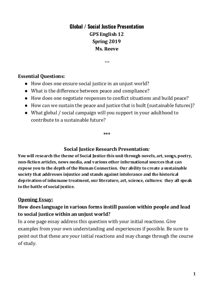 Global / Social Justice Presentation GPS English 12 Spring 2019 Ms. Reeve ***Essential Questions: How does one ensure social justice in an unjust world? What is the difference between peace and compliance?