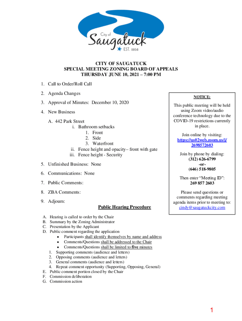 CITY OF SAUGATUCK SPECIAL MEETING ZONING BOARD OF APPEALS THURSDAY, JUNE 10, 2021 7:00 PM 1. Call to Order/Roll Call 2. Agenda ChangesNOTICE:3. Approval of Minutes: December 10, 2020 4. New Business