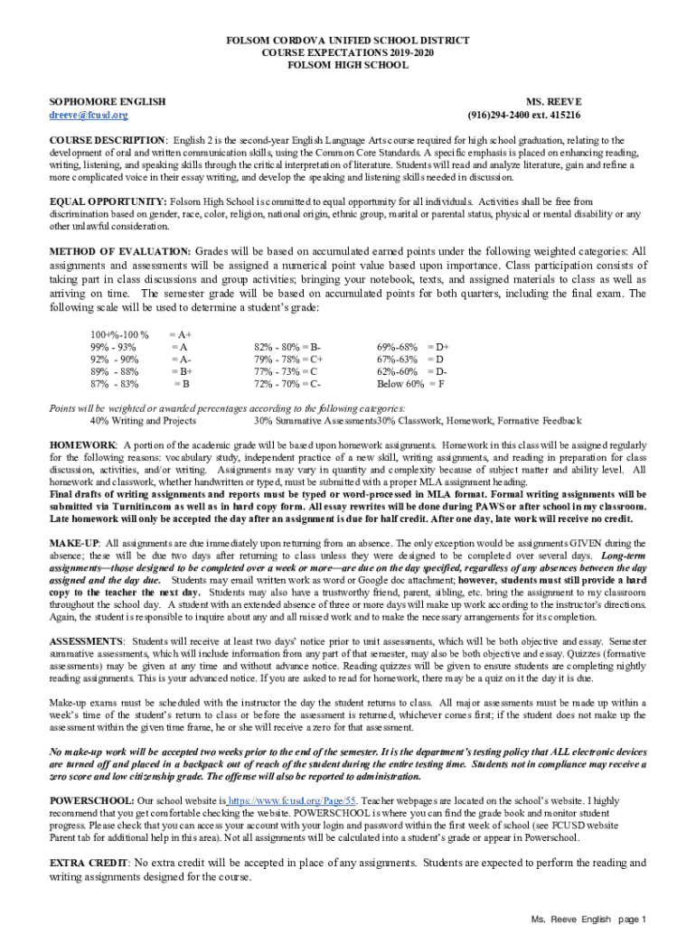 FOLSOM CORDOVA UNIFIED SCHOOL DISTRICT COURSE EXPECTATIONS 20192020 FOLSOM HIGH SCHOOL SOPHOMORE ENGLISH dreeve@fcusd.orgMS. REEVE (916)2942400 ext. 415216COURSE DESCRIPTION: English 2 is the second