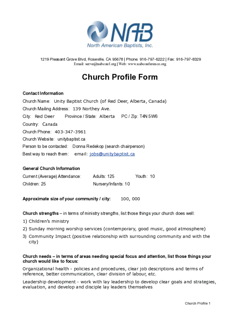 1219 Pleasant Grove Blvd, Roseville, CA 95678 | Phone: 9167976222 | Fax: 9167978329 Email: serve@nabconf.org | Web: www.nabconference.orgChurch Profile Form Contact Information Church Name: Unity