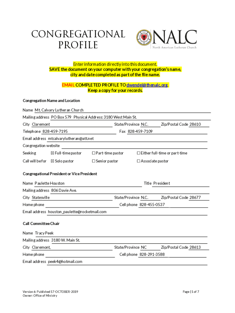 CONGREGATIONAL PROFILE Enter information directly into this document. SAVE the document on your computer with your congregations name, city and date completed as part of the file name. EMAIL COMPLETED