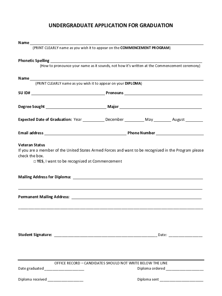 To fill out the undergraduate application for graduation, students must follow the instructions provided by their institution, which typically involves submitting personal information, completing degree requirements, and paying any necessary fees.