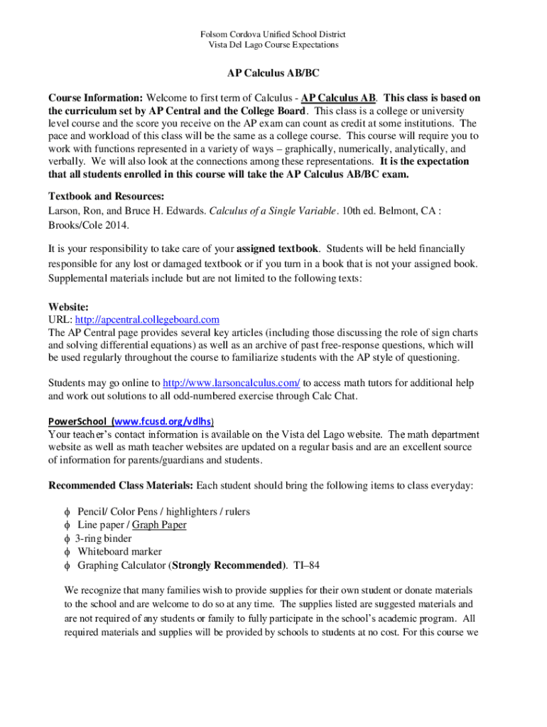 Folsom Cordova Unified School District Vista Del Ago Course Expectations AP Calculus AB/BC Course Information: Welcome to first term of Calculus AP Calculus AB. This class is based on the curriculum