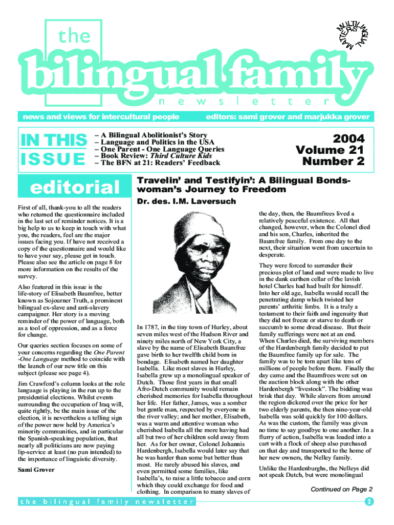 News and views for intercultural people IN THIS ISSUE A Bilingual Abolitionists Story Language and Politics in the USA One Parent One Language Queries Book Review: Third Culture Kids The BFN at 21: