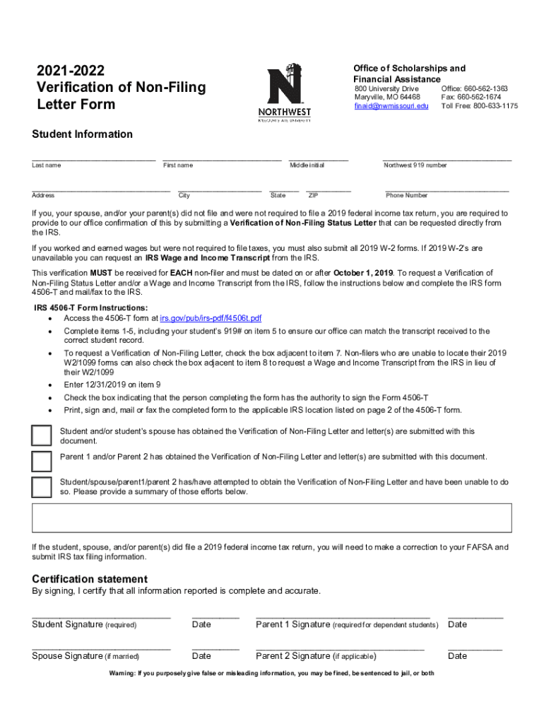 Obtain the 2021-2022 verification of non-filing form from the appropriate source, such as the IRS website.